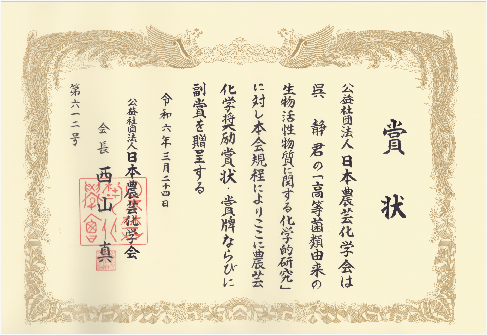 呉静特任助教が日本農芸化学会にて、2024年度日本農芸化学奨励賞を受賞しました。