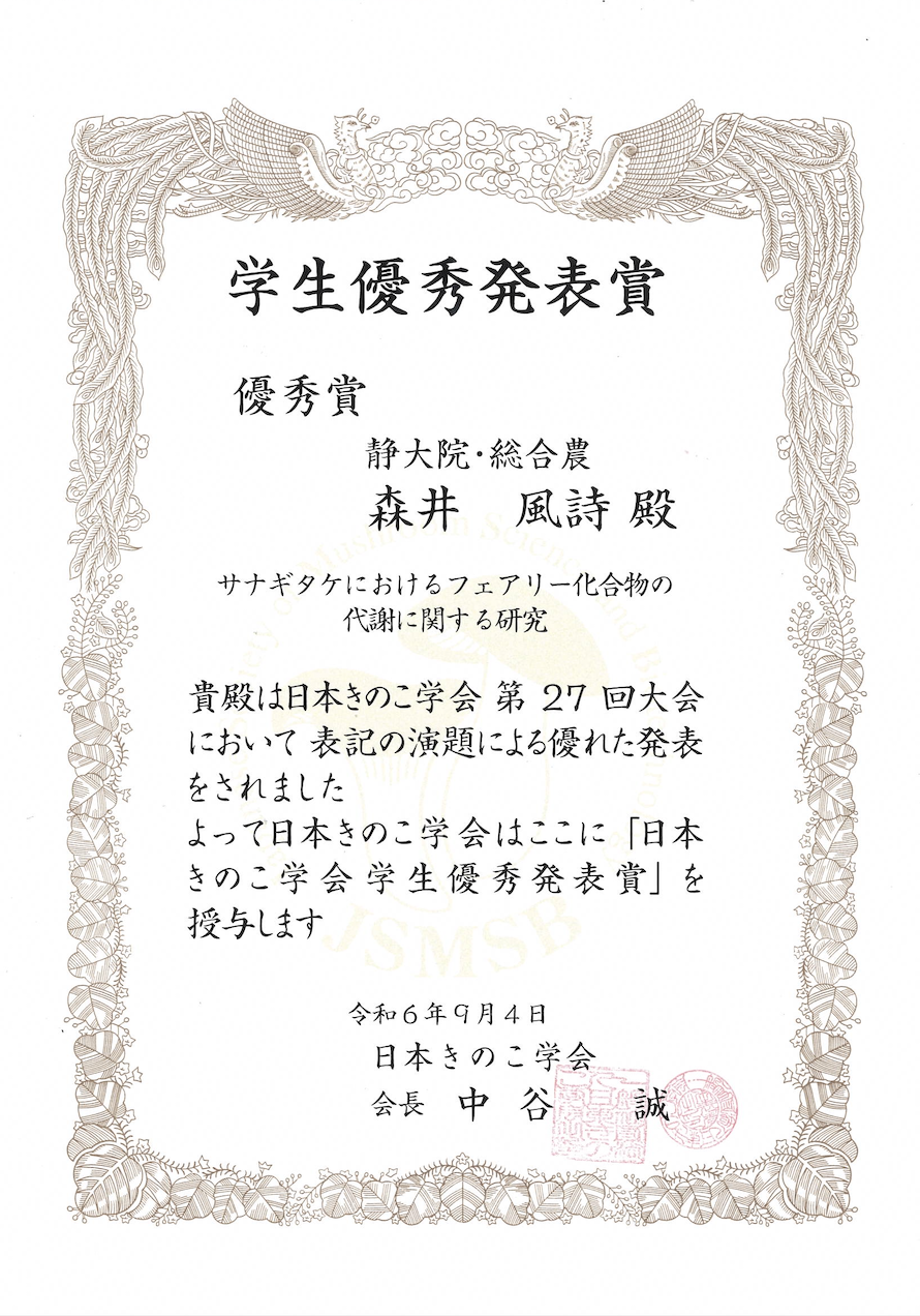 森井風詩さんが日本きのこ学会第 27 回大会にて「学生優秀発表賞」を受賞しました。