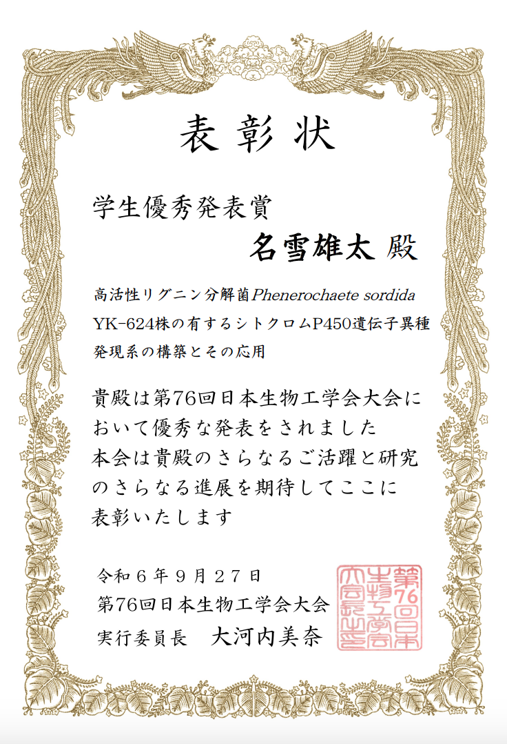 名雪雄太さんが第76回日本生物工学会にて「学生優秀発表賞」を受賞しました。