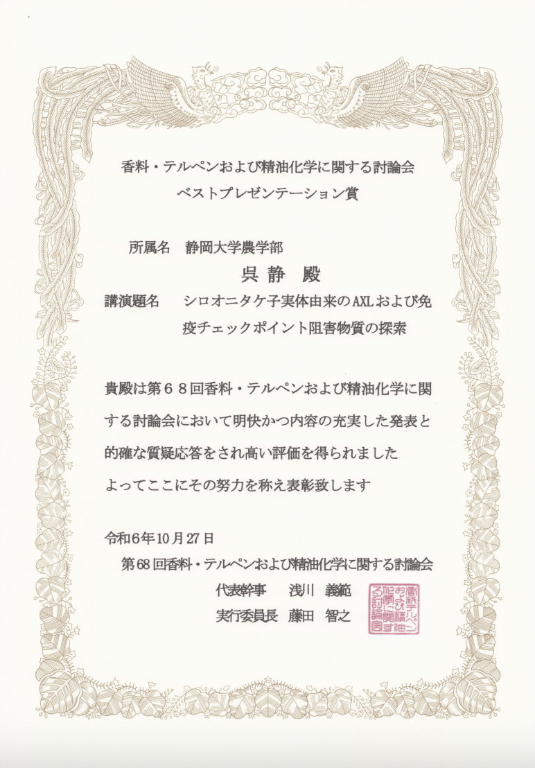 呉静特任助教が2024年度香料・テルペンおよび精油化学に関する討論会でをベストプレゼンテーション賞を受賞しました。
