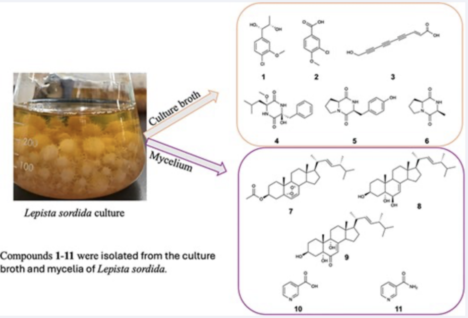 "Fairy rings" are zones that stimulate or inhibit grass growth, caused by interactions between a fungus and a grass. Lepista sordida is one of the fairy ring-forming fungi. (1S,2S)-1-(4-chloro-3-methoxyphenyl)propane-1,2-diol (1) along with 10 compounds (2-11) was isolated from the culture broth and mycelia of L. sordida. The structures were identified by spectroscopic data analyses, and this was the first reported isolation of 1 from a natural source. The plant growth regulatory activity of 3-6 was investigated using bentgrass seedlings. Compound 3 promoted root growth at 0.1 μmol/paper, while inhibited it at 1 μmol/paper. Compound 4 inhibited root growth at 0.1 and 1 μmol/paper. Compound 6 significantly promoted shoot growth at 1 μmol/paper.