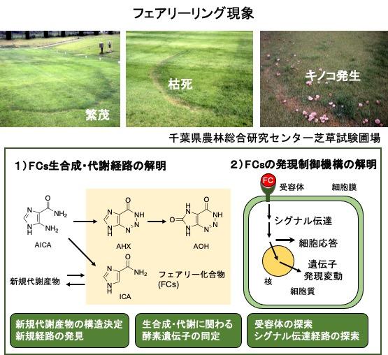 芝が輪状に周囲より繁茂あるいは生育抑制され,後にキノコが発生する現象を「フェアリ ーリング」という。キノコからフェアリーリング現象の原因物質であるフェアリー化合物(Fairy Chemicals; FCs)を発見し,FCsは植物に内生し,生物的・非生物的ストレス耐性を植物に与え農作物の増収をもたらすことを明らかにした。さらに,FCsはプリン代謝経路上で生合成されることが明らかにした。